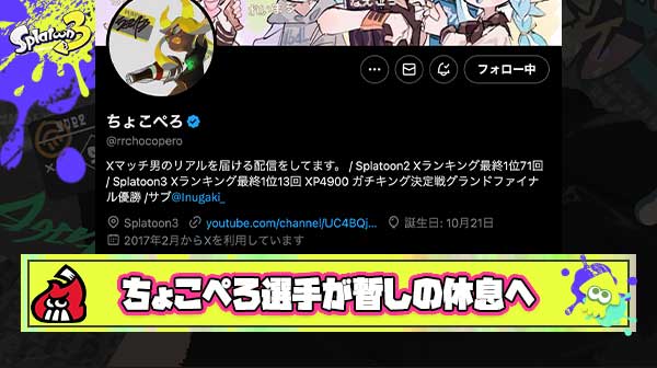 全スプラプレイヤーに夢と希望を与え続けたちょこぺろ選手が今シーズンXP5000チャレンジ辞退を宣言
