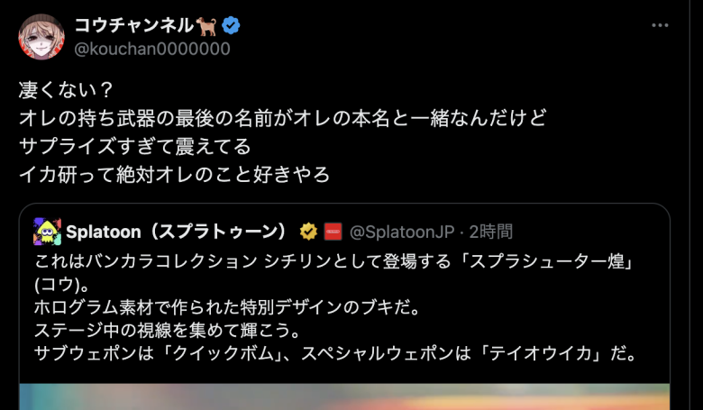 【祝報】コウチャンネルさん「持ちブキが本名と一緒になった、イカ研は絶対オレのこと好き」